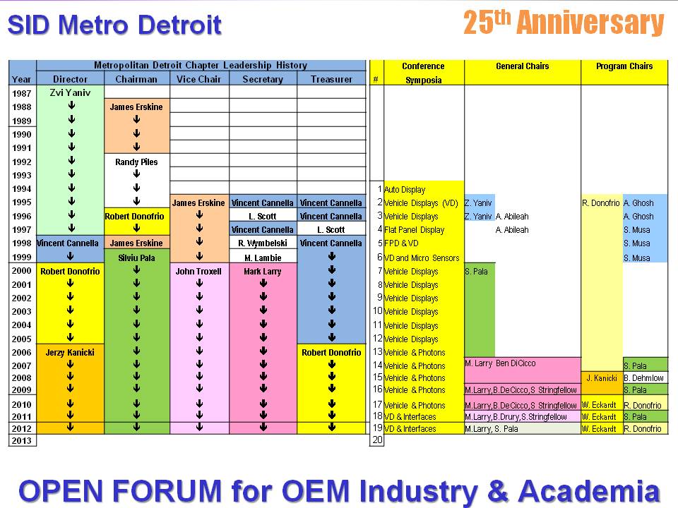 Following the formation of the Chapter, many volunteers have participated in building and sustaining the Chapter and extending the knowledge of the use of display system in vehicles. Some of these volunteers are shown in the attached "Historical Summary" of the Metropolitan Detroit Chapter of SID.
